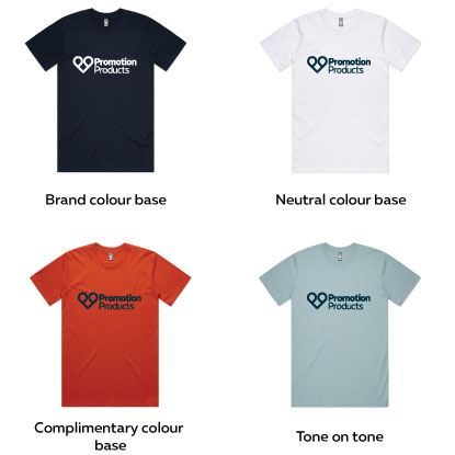 - Neutral colour product with brand colour print: The product is a neutral colour (such as white, black, or grey) with the logo or message printed in the brand’s primary colours.