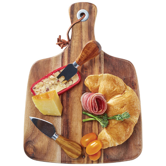 A trendy acacia cheese board and knife set that includes your beautifully decorated logo.