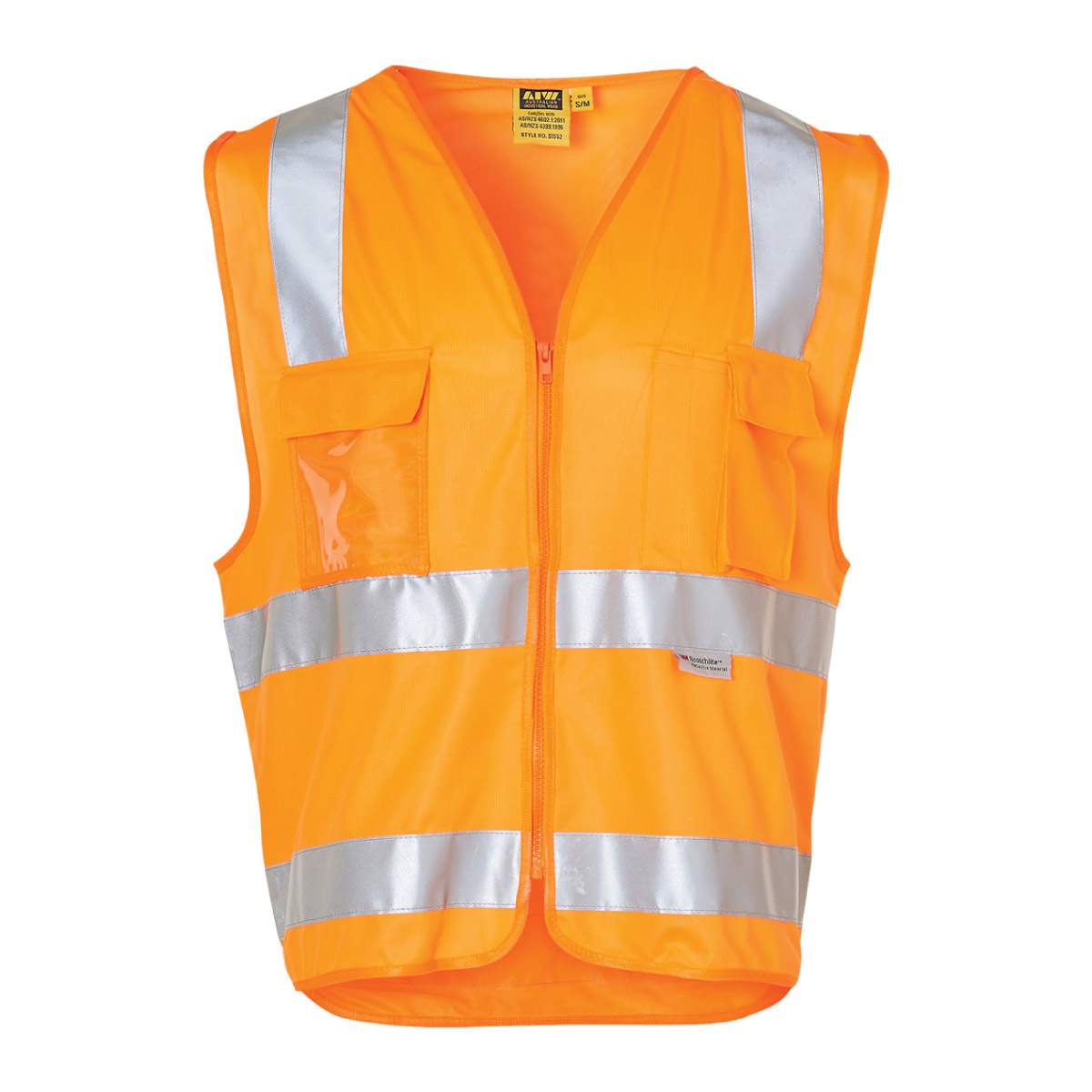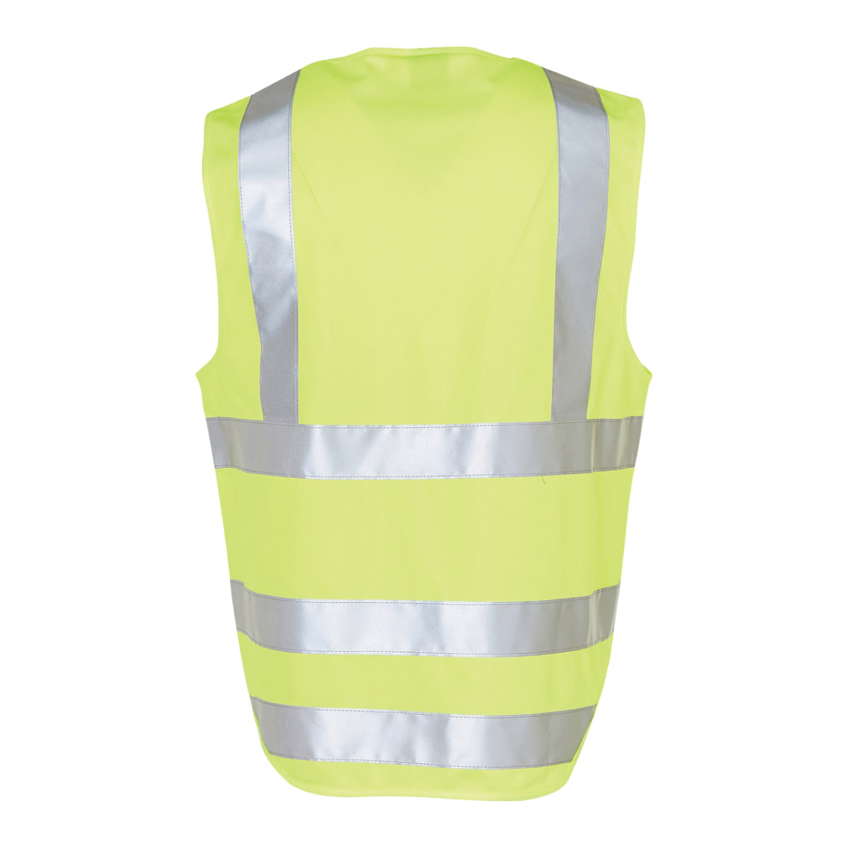 A custom printed hi-vis safety vest with front pockets that can be used day or night.