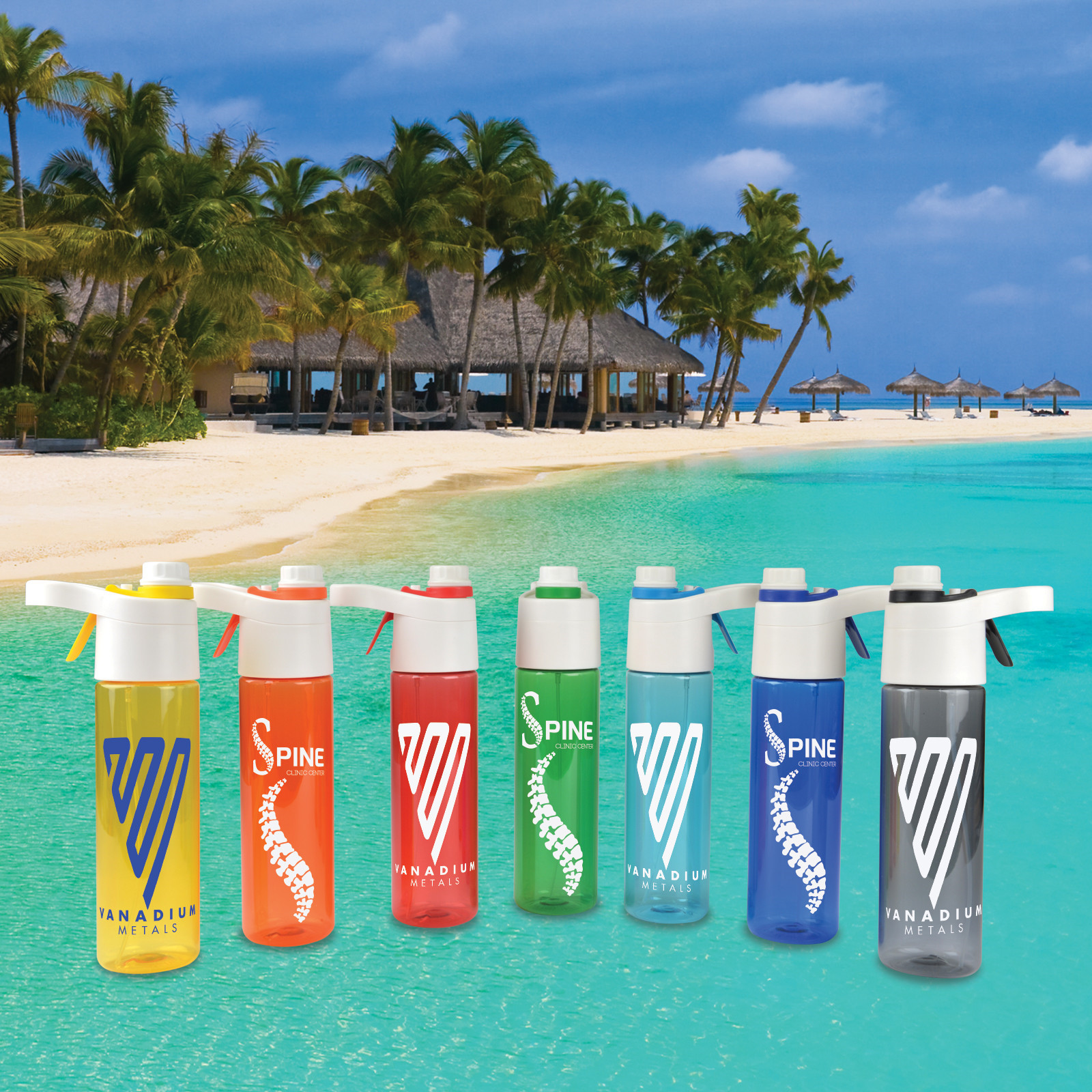 A promo kit that includes: sunglasses, a water bottle/mister and a short handle coloured calico bag!