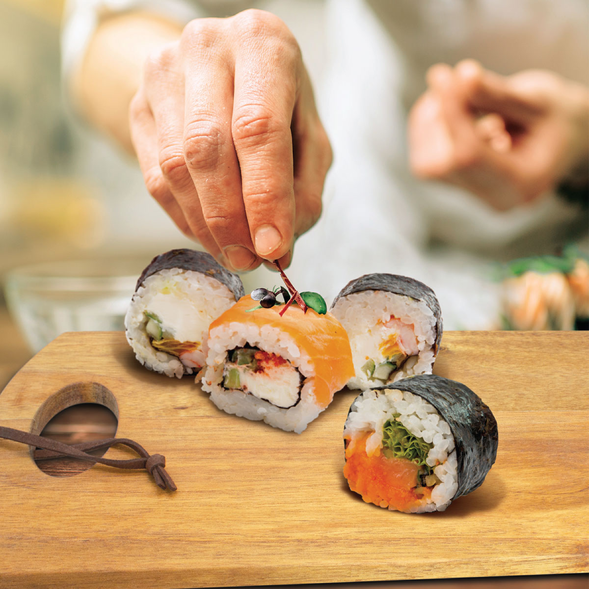 A classic serving food board made of FCS approved acacia wood with a leather strap.